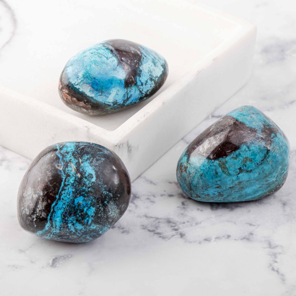 Léčivé vlastnosti: chryzokolu se říká někdy také kámen žen, protože léčí všechny typické ženské problémy, zejména ty, které jsou spojeny s hormony a reprodukcí, od puberty až do konce života. Zmírňuje bolesti při porodu. Absorbuje horečku i bolest ( u žen i mužů), harmonizuje štítnou žlázu a stabilizuje hladinu cukru. Vhodný pro oběti incestu a zneužití.