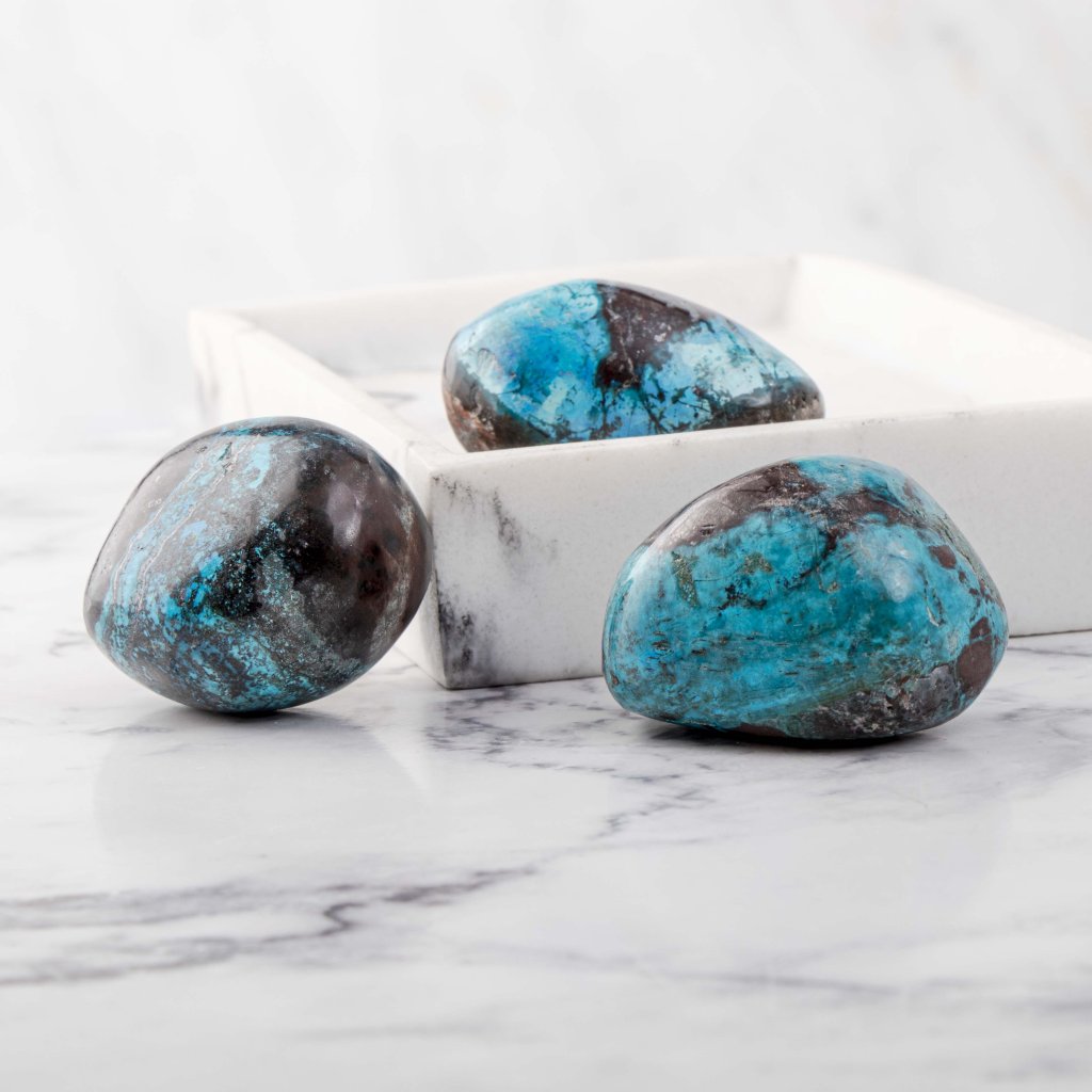 Vlastnosti: cyklosilikát, vodnatý křemičitan mědi. Barevně velmi pestrý kámen, slučuje různé odstíny tyrkysové až azurově temněji modré, se světlými až hnědými skvrnkami a pásky.