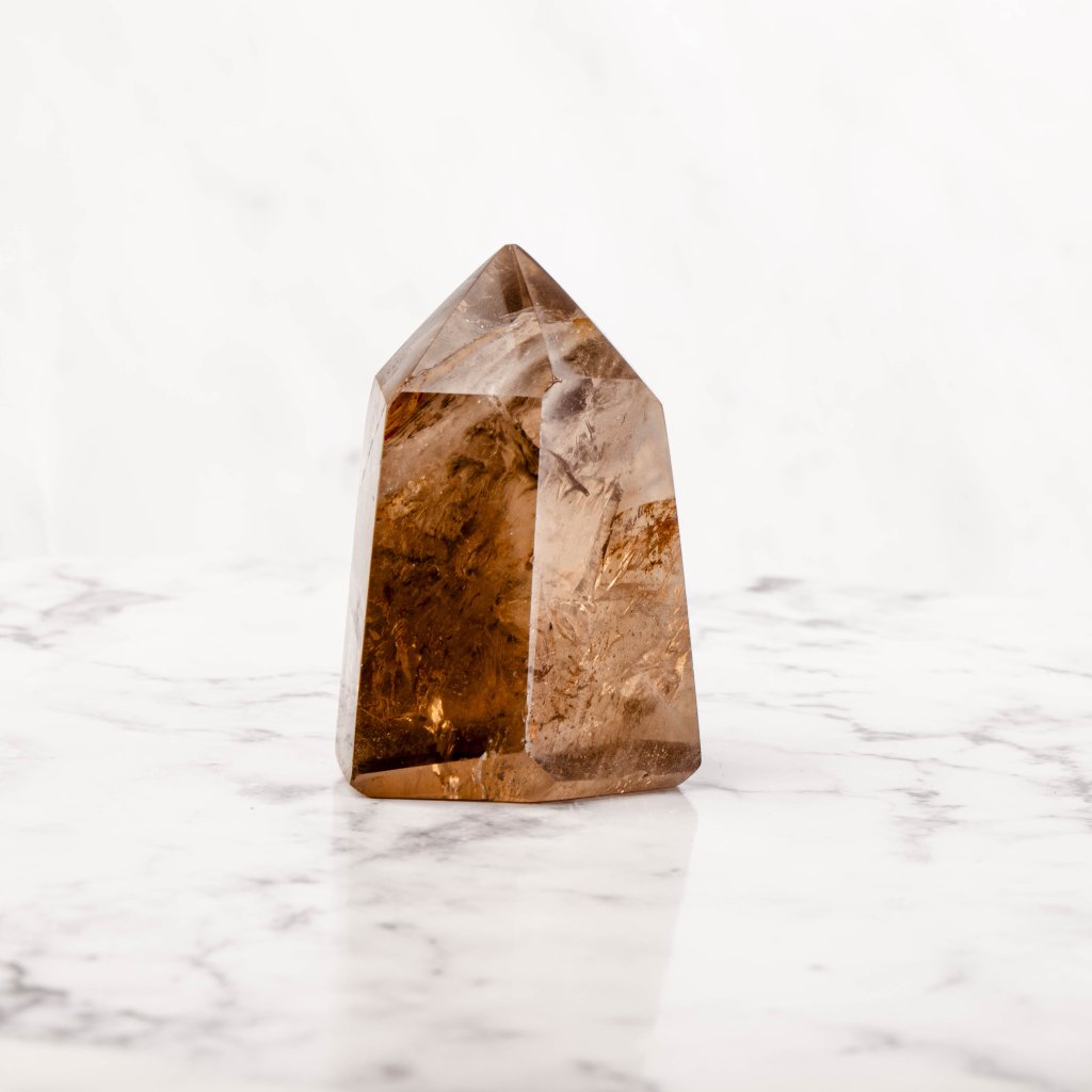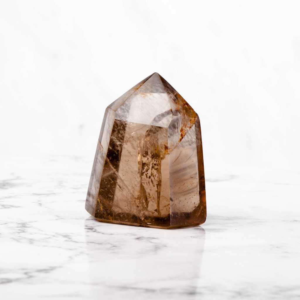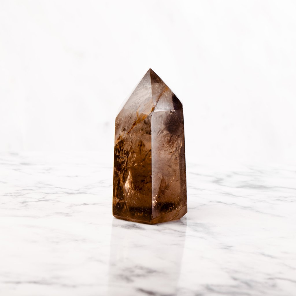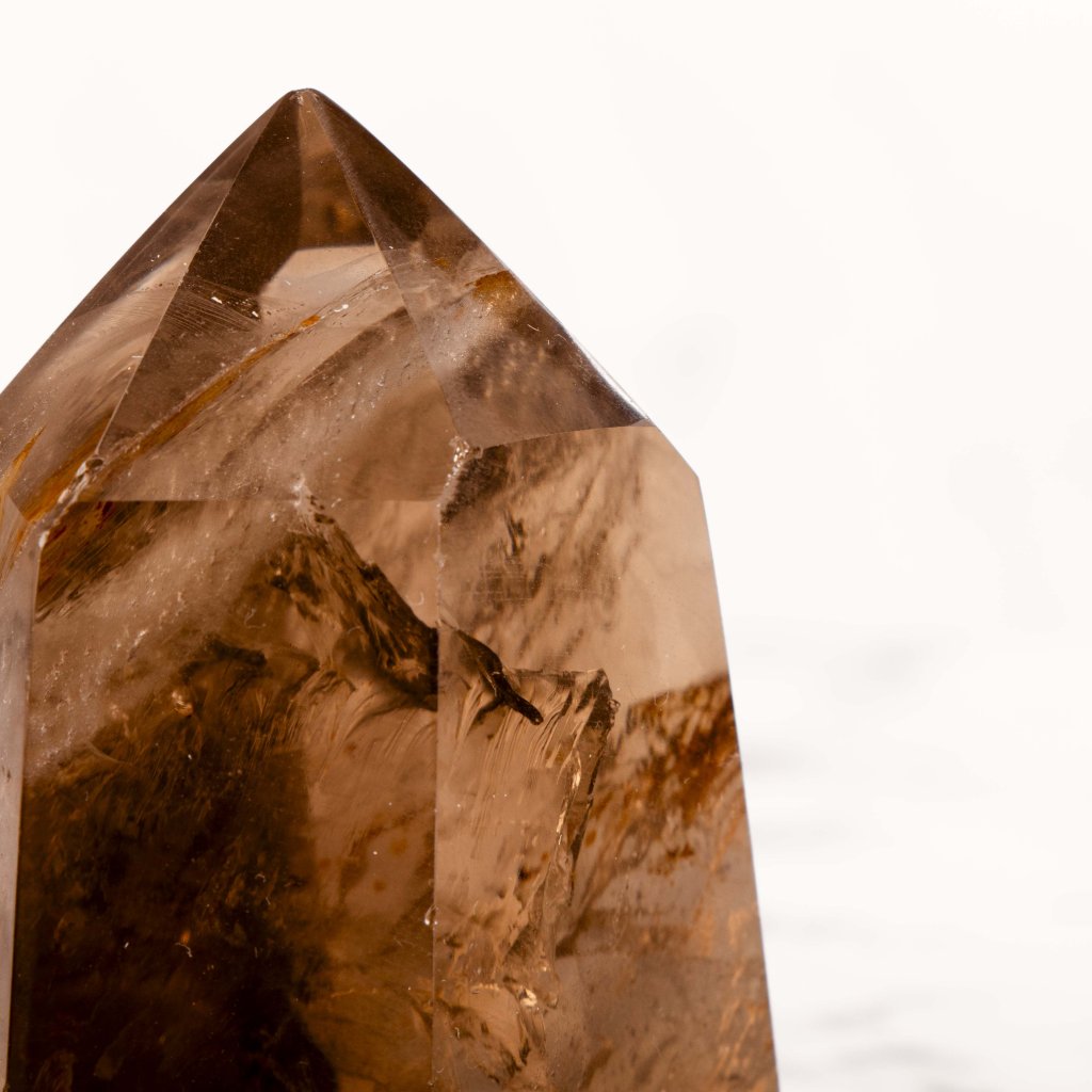 kouřový křemen, průhledný světle hnědo šedý, až tmavý nebo méně průhledný. Může mít inkluze.